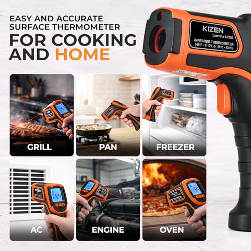 The KIZEN LaserPro LP300 has an emissivity range of 0.1 to 1.0 for precise readings across different surfaces and conditions. For best results, you should be 14 away from the object you re measuring before pressing the trigger of the IR thermometer gun and releasing to get live temperature readings anywhere between 58 F and 1112 F 50 C and 600 C . Whether you re checking the heat of your oven or griddle, completing HVAC projects, or measuring the temp of any vehicle s engine, this product will provide quick and accurate readings.